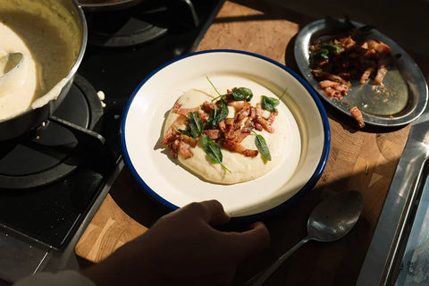 “We ate in the places where people literally just go in for a pie,” adds Charlie, “because that’s a ritualistic part of what they eat, week-to-week. So, our pork pie is pretty normal in that respect. It's good and honest and then Sweyn has made it slightly fancy, but it’s not too clever.” Not fancy, just solid, Sewyn offers. “We make the lard from the pigs. We make the meat from the pigs. We make the pastry from the lard. We make the jelly from the bones of the pigs.”