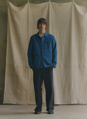 Mid-weight herringbone. Organic cotton and linen blend. Cutaway collar. Patch pockets. Inner hanging loop. Corozo buttons.