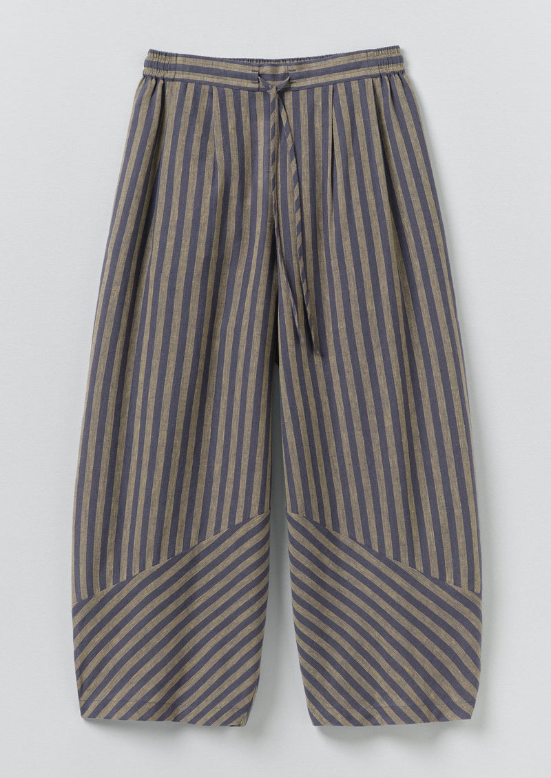 Our trousers feature wide cuff panels with a contrasting stripe direction for a graphic note. Made from an organic cotton and linen blend to an easy shape with an elasticated drawcord waist.