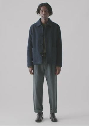 Tonal check wool. Large side patch pockets. Internal hanging loop. Half twill lining. Internal patch pocket. Corozo buttons.