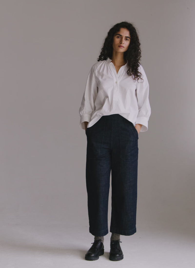 Our effortless shirt is made from organic cotton oxford which is comfortable against the skin. Shaped with a band collar and raglan sleeves, with delicate gathers.