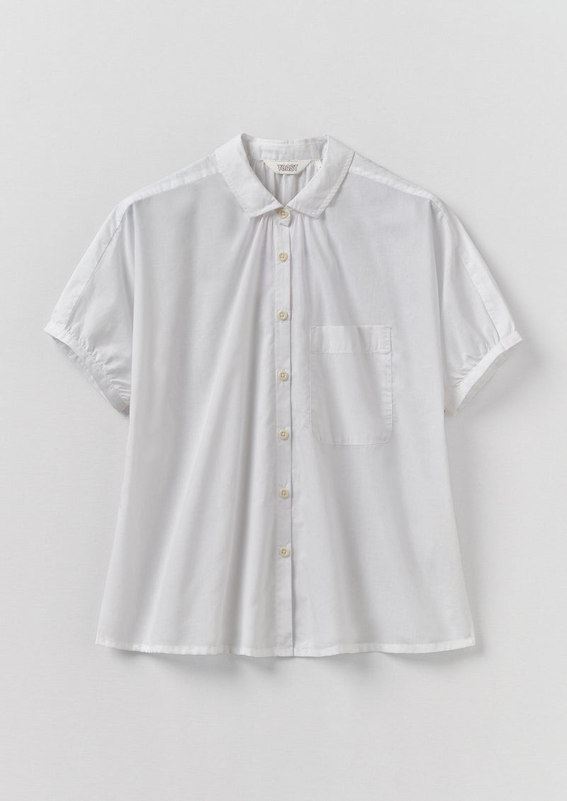 Organic cotton chambray. Garment washed. Side hem slits. Chest patch pocket. Gathered sleeves and neck. Shoulder panels. Turn-back placket. Corozo buttons.