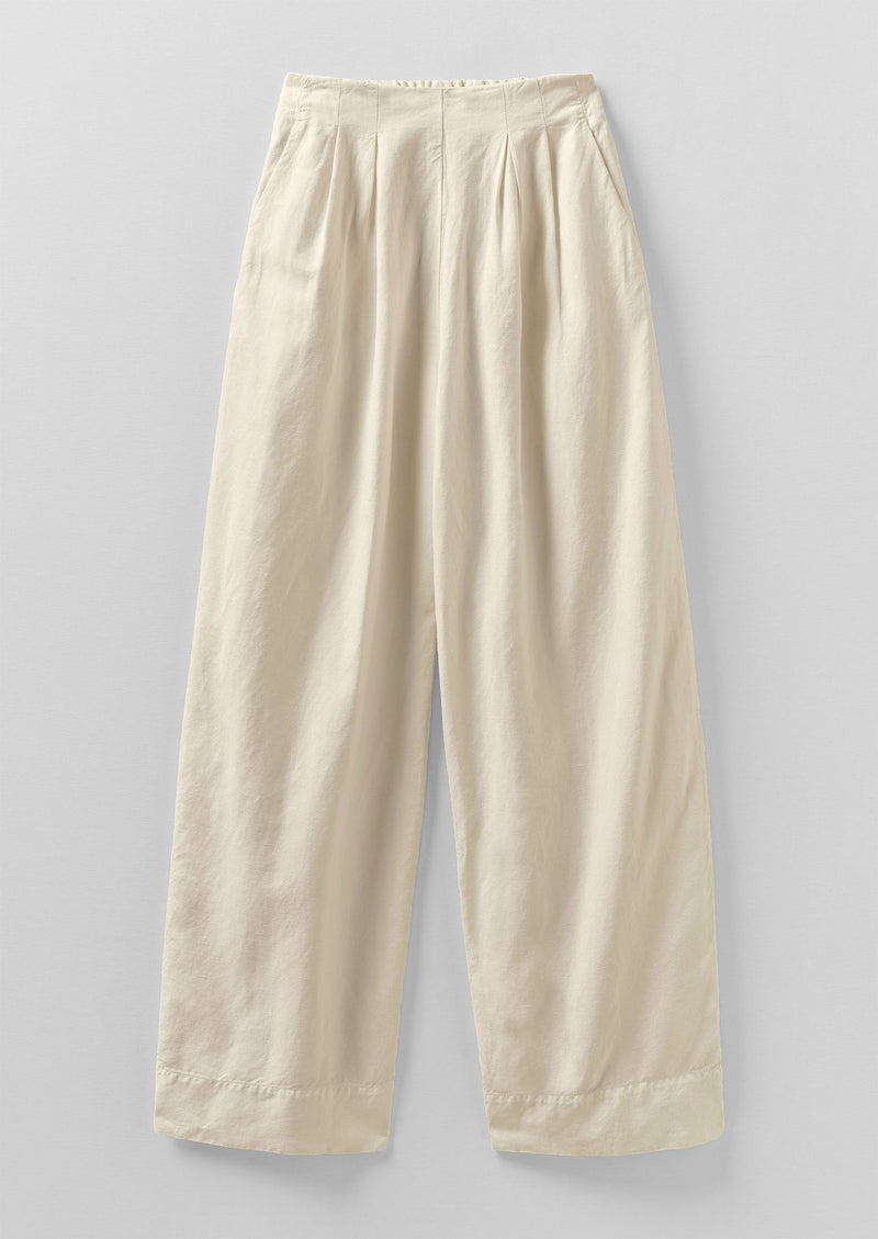 Organic cotton and linen blend. Elasticated back waist. Inverted box pleats. Side pockets. Back jet pockets. Wide legs.