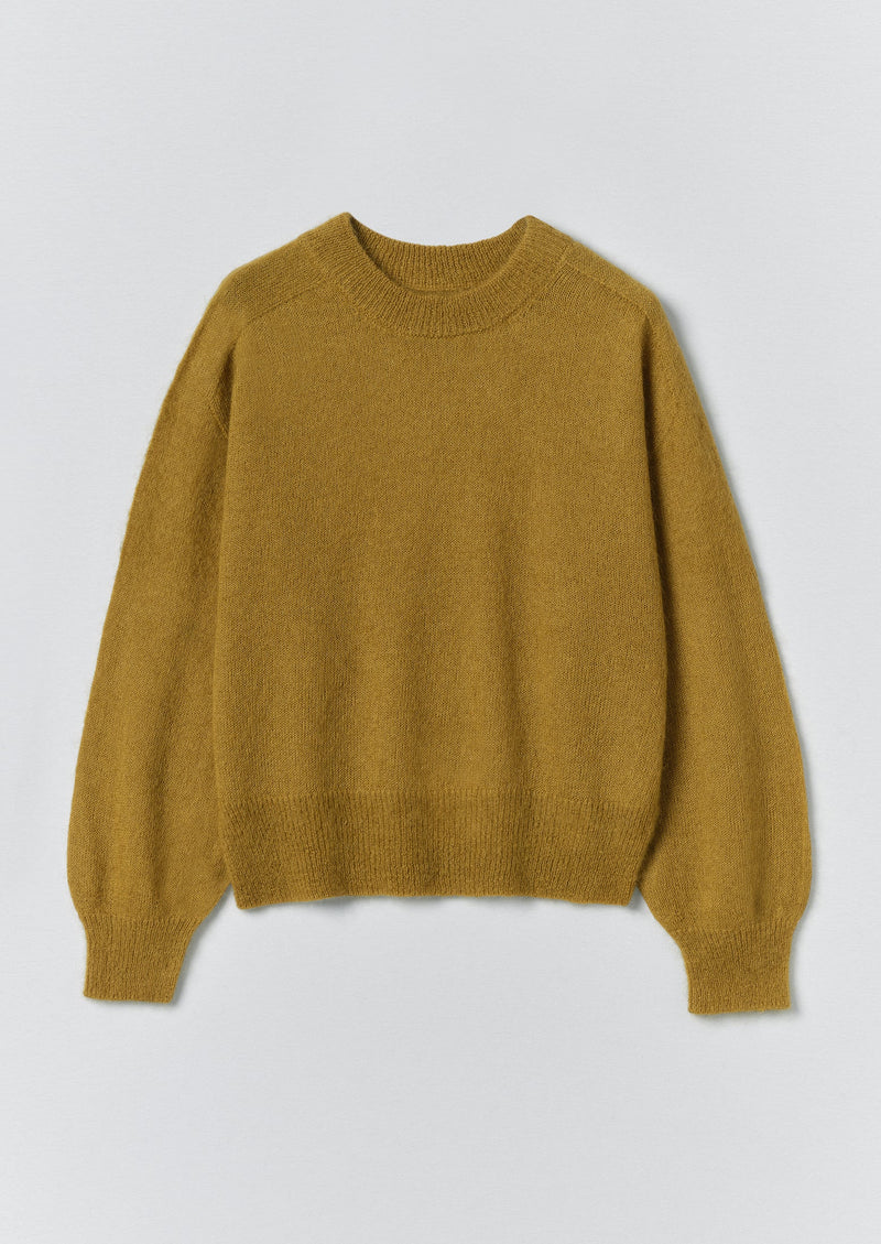 Mohair and cotton blend. Easy shape. Crew neck. Dropped shoulder. Rounded sleeves. Neat cuffs. Ribbed edges.