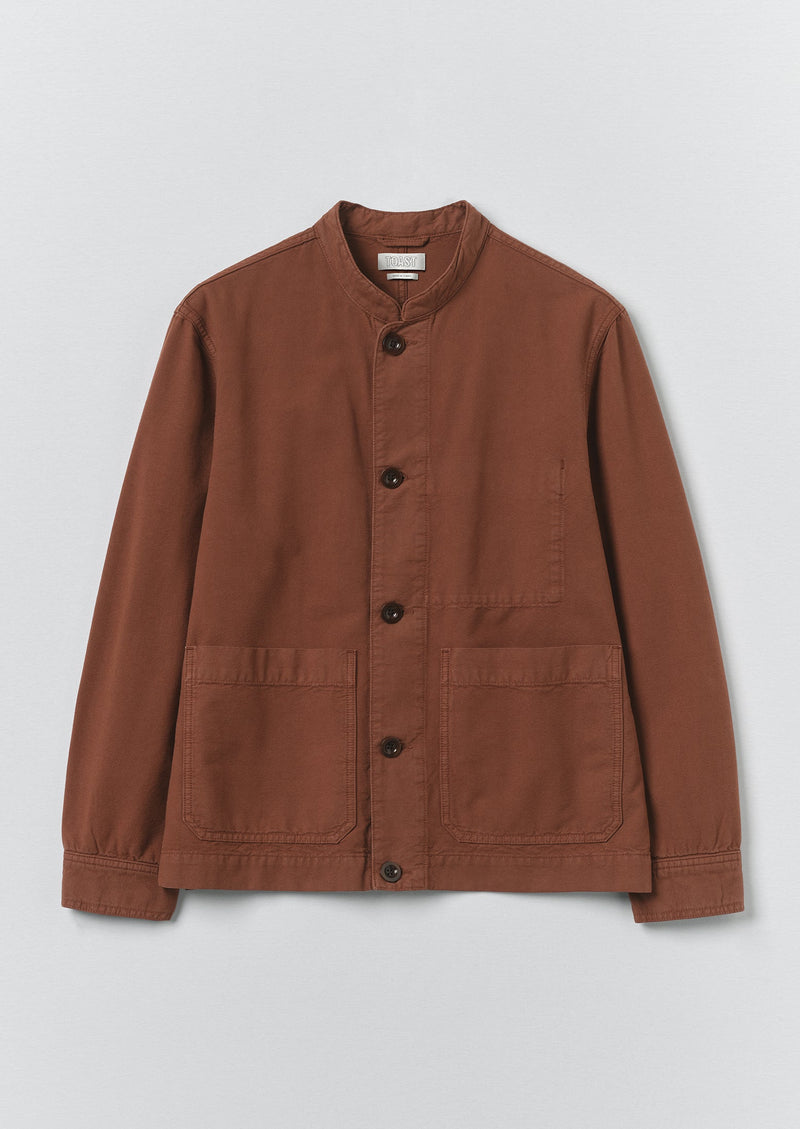 Organic cotton canvas. Garment-dyed. Easy shape. Stand collar. Full-length sleeves. Buttoned cuffs. Internal chest pocket. Side patch pockets. Mid-hip length. Corozo buttons.