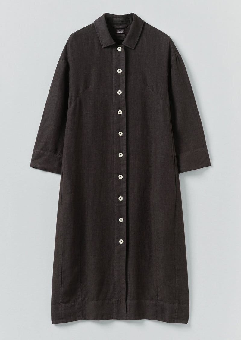Our shirt dress is made from a textural garment-dyed linen, cut to a relaxed fit, falling to the lower calf and shaped with darts at the hem. Side pockets maintain an easy silhouette. Fastened with corozo buttons down a full length placket.
