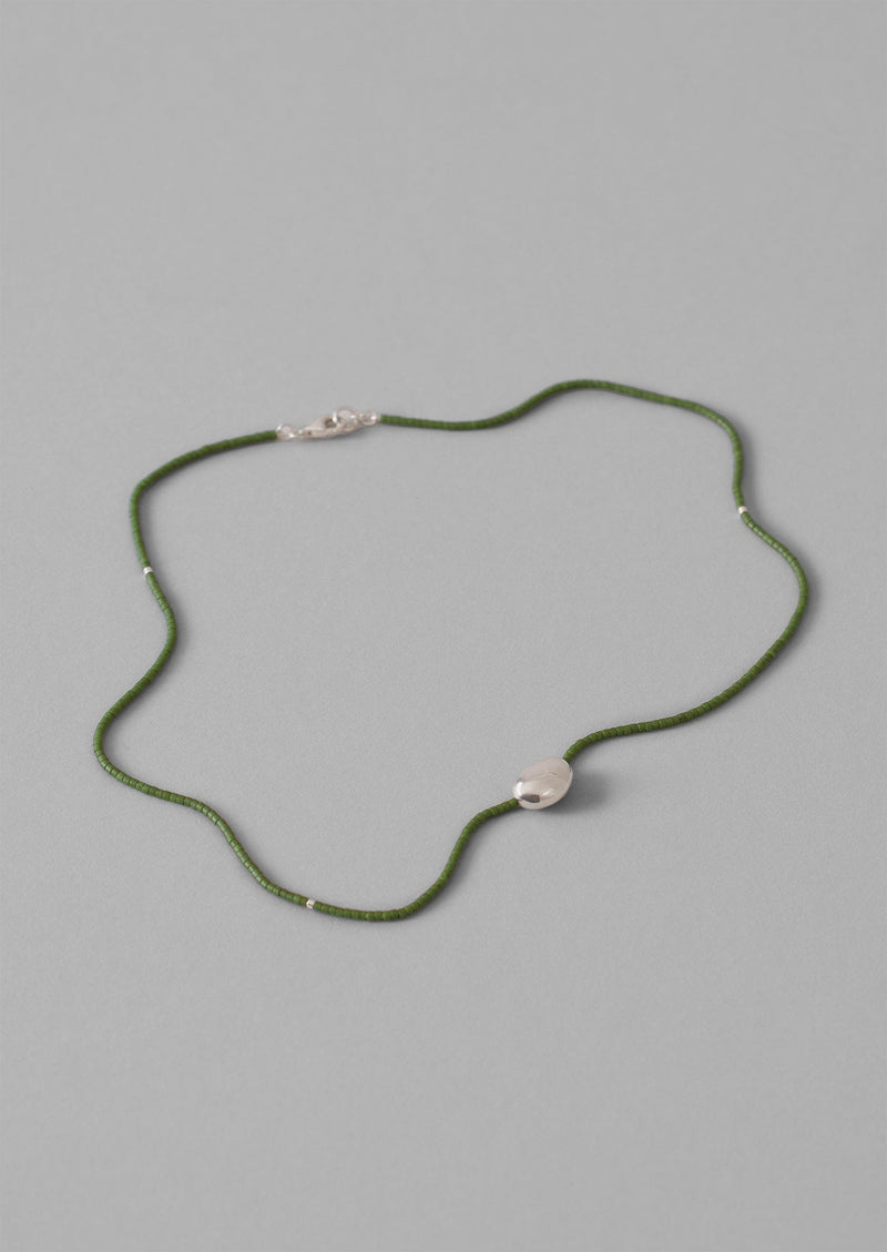 Spanish jeweller Helena Rohner uses uniform Japanese Miyuki beads and a central silver pendant to create this delicate necklace, threaded together with a fine sterling silver chain.