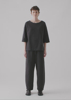 A barrel leg shape brings volume through the legs of our trousers, made from organic cotton jersey. With an elasticated waist and back patch pocket.
