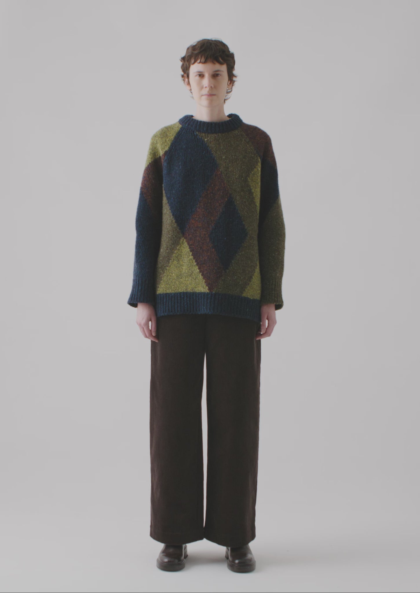 Our sweater is knitted with an abstract Argyle-inspired design from a flecky Donegal merino wool. Shaped with a crew neck and raglan shoulders with side splits for easy layering. Finished with ribbed edges.