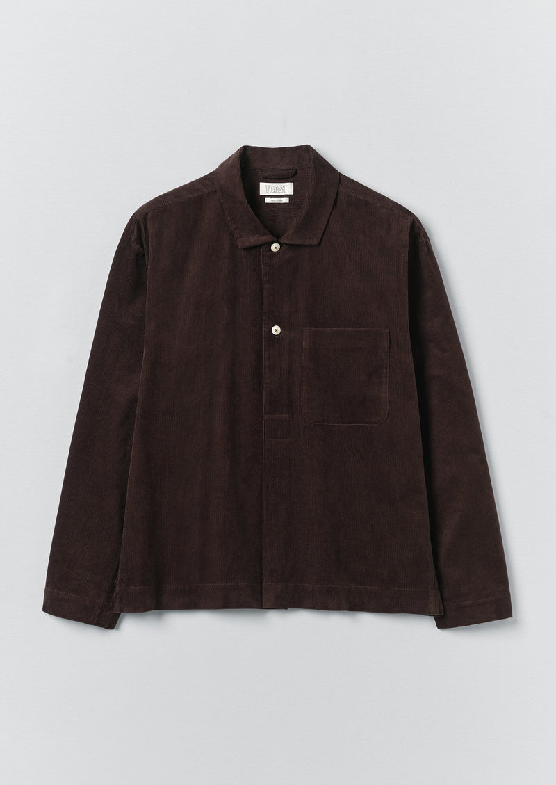 Organic cotton cord. Relaxed fit. Subtle knife pleat. Half placket. Loop and button closure. Chest patch pocket. Corozo buttons.