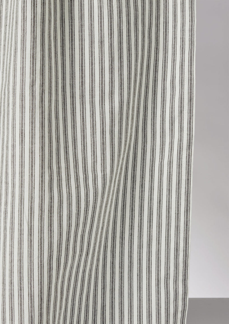 Double-layered shower curtain, with the outer made from ticking stripe organic cotton and the waterproof inner made from recycled plastic bottles. With stainless steel eyelets, a weighted hem and a coordinating bag for storage.