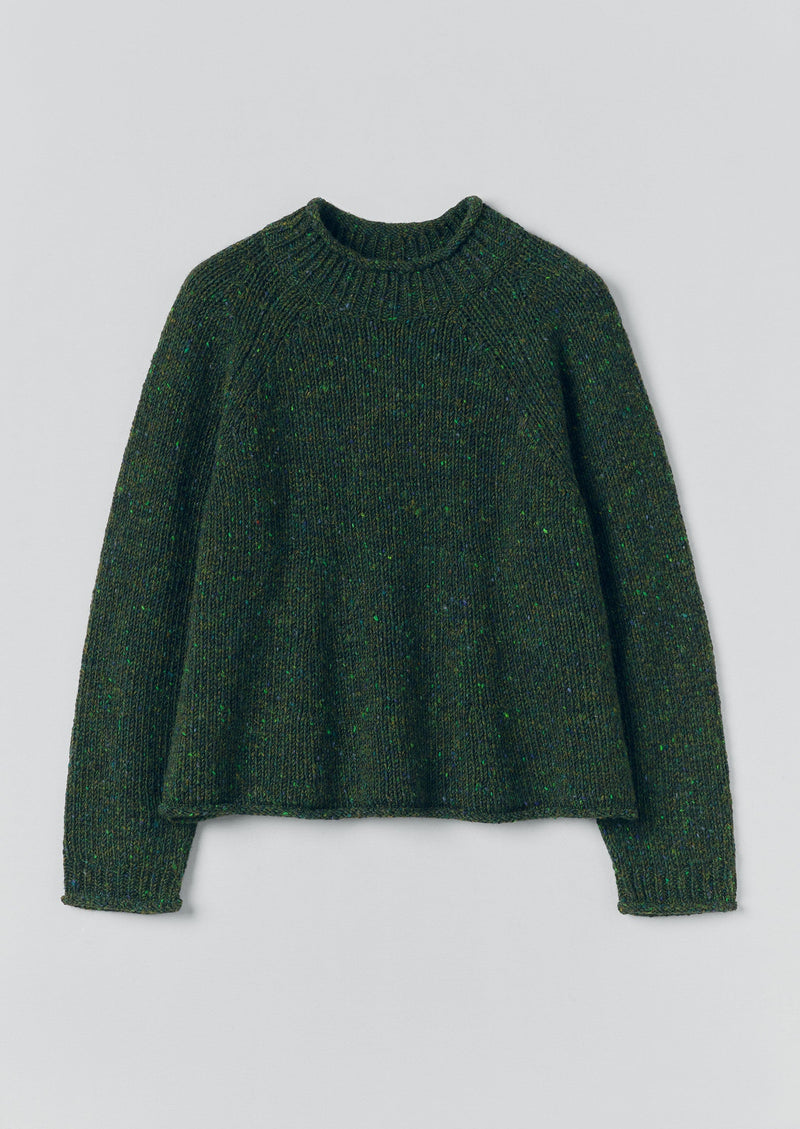 Our easy sweater is knitted from warm wool spun in Donegal, Ireland, with a characterful nepp. Shaped to a mid-hip silhouette with raglan sleeves and ribbing at the neck and hem, then finished with effortless rolled edges.