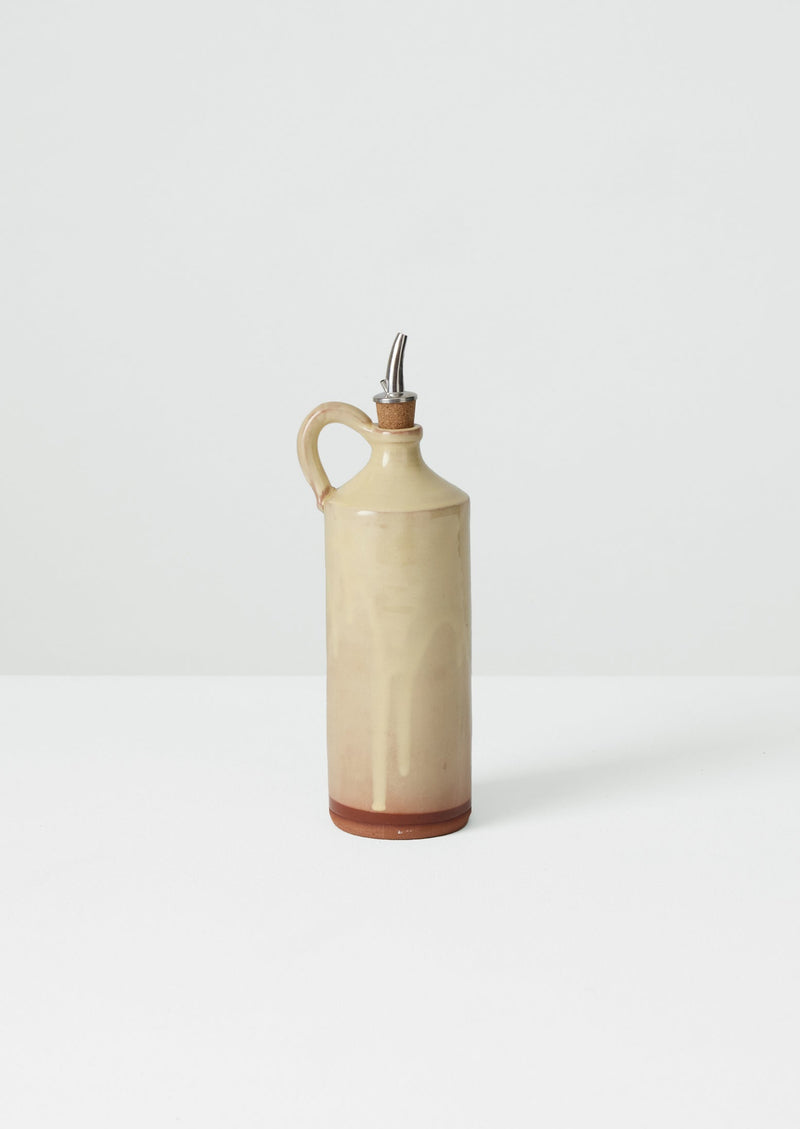 Earthenware oil pourer handmade in Aubagne, southern France by artisans at Poterie Barbotine. Inspired by classic Provencal ceramics, it is hand-thrown from locally sourced clay and features a small handle with a metallic spout.