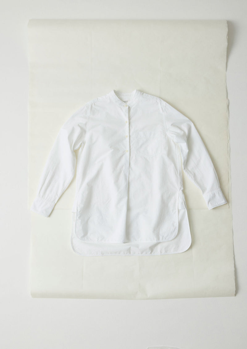 Our versatile shirt is made from lightweight organic cotton Oxford. Collarless with a half placket, it falls to a straight shape with a stepped, curved hem.