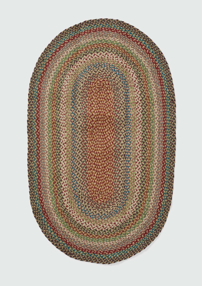 Uplifting, bright rug from The Braided Rug Company, hand-braided from organic jute by women artisans in Bangladesh to an elongated oval shape. Double-sided and durable, with colourful stripes and a soft curved edge.